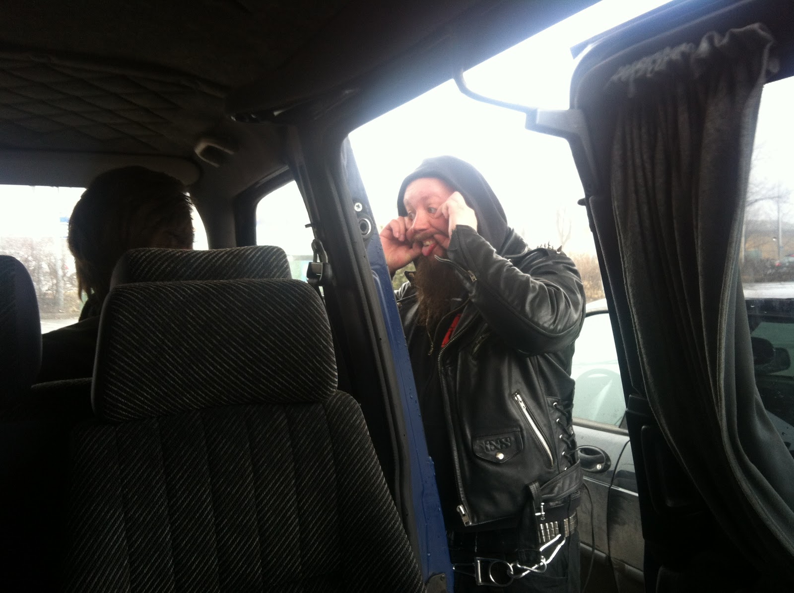 Pikkunen krapulanpoikanen oli tullut muutamasta eilisestä drinkistä joten eiköhän hoidettane mokoma pois ihan samoin tein. Tuntui maistuvan muillekin jäsenille joten matkastahan tulee siis hauska. Tolsberg viritti puhelimeensa Garage Bandin ja sit viritti sen puhelimen kiinni auton hifijärjestelmään. Sävellystyö alkoi välttömästi ja haluankin tässä ensiesittää teille tulevalta albumilta kappaleen Lajinsa Kullakin (minulla ei laulu, eikä sinulla naamataulu).